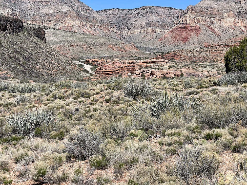 I had hiked this section before, so I knew it would not be difficult. There were no large side canyons to deal with. We wanted to camp somewhere in Tuckup close to water and our exit canyon. There is always water in Schmutz Spring, but it is out of the way and not very easy to get to. Another place where I've previously found water is in the Tuckup drainage where it narrows to a tight canyon, and where the "trail" leaves the drainage to avoid these narrows. When I was there a few years ago, there were deep potholes in this dark and a somewhat foreboding canyon. But when we got to bed of Tuckup, we found nice potholes on the Esplanade nearby. So we set up camp there. We spent the afternoon lazing around under the overhang near our camp.