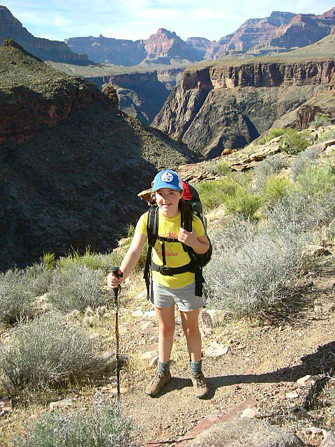 Click on photos to see larger image. Today's route stats: Distance: 5.5 miles Elevation Gain: 800 feet Elevation Loss: 200 feetToday would be our longest day so far, although tomorrow's hike to the rim would be longer and have more elevation gain. The hike back to our camp on Boucher Creek was an easy stroll, gaining only 220 feet. But from there to the turnoff to the Boucher Trail we gained an additional 600 feet in only 0.8 miles. Once on the Tonto Trail, the going was easy and mostly level, with lots of small ups and downs. Although a lot of people think the Tonto Trail is too monotonous and has too many long detours to get around side drainages, I like the Tonto for the awesome views. |