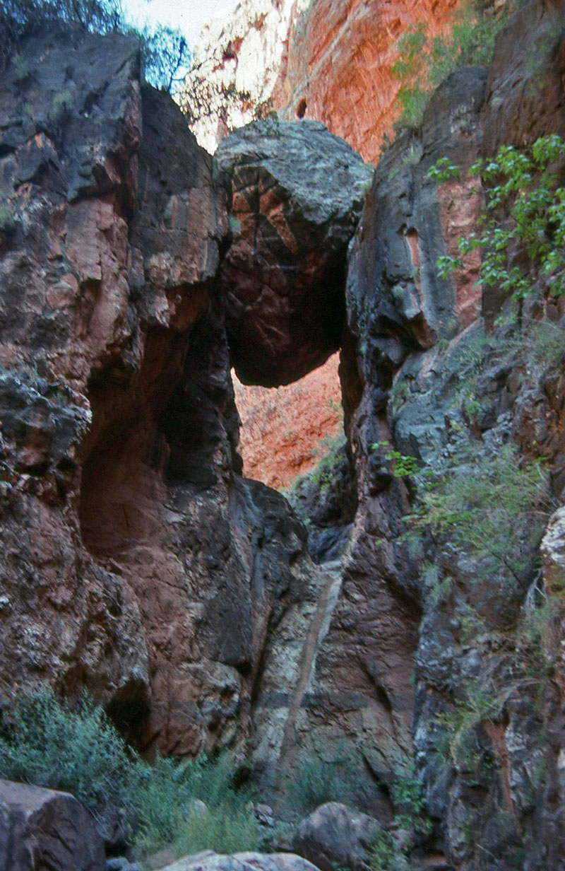 Click on photos to see larger image. Today's route stats: Distance: 2.5 miles Elevation Gain: 850 feet Elevation Loss: 0 feetWe only had 2.5 miles to hike today, so we all slept in later than usual. I remember the hike to the "hippie camp" very easy. We passed a spring area with lots of vegetation that slowed us down a bit. When we got to the hippie camp, we weren't certain we were actually there at first. I was expecting something pretty significant, but there were only a few rock-lined paths and a camping area, at that was about it. Obviously some effort was put into modifying the area for longer term camping, but really not very much. |