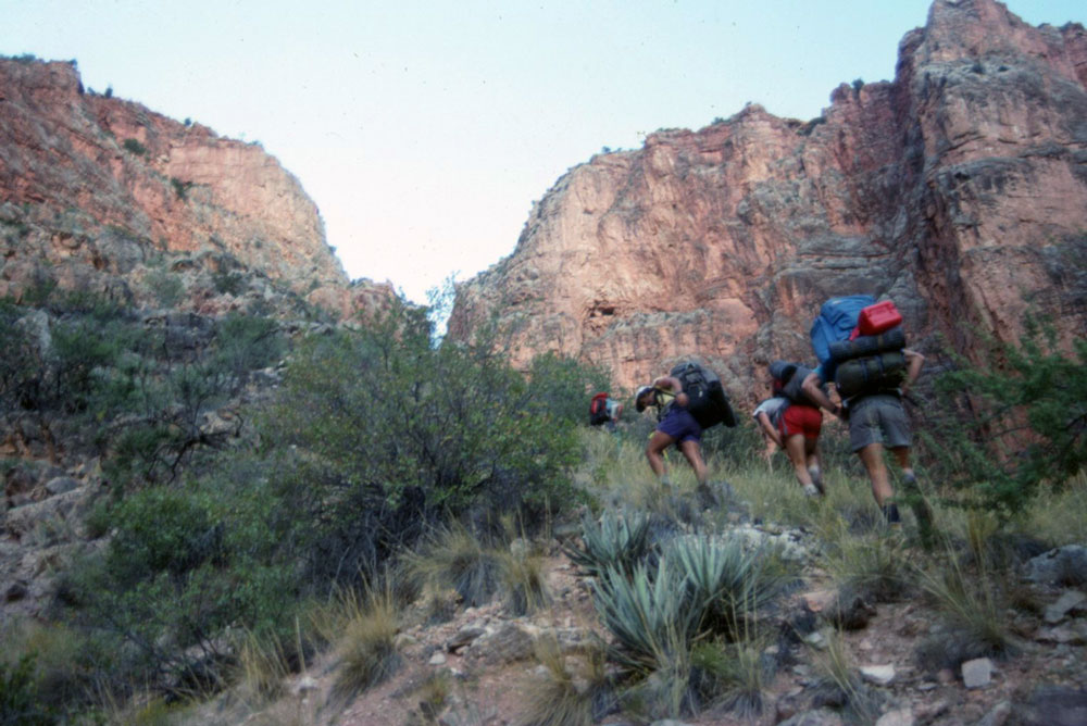 Today's route stats: Distance: 4.5 miles Elevation Gain: 3600 feet Elevation Loss: 0 feetToday was expected to be long and difficult. Within 10 minutes of leaving camp we began climbing the steep slope which ends at the very steep Redwall climb. The difficulty with the climb, as I remember it, was that the slope was steep, but not steep enough to haul packs, and the rock was not solid. Steve Allen is a very good climber with lots of experience, so he volunteered to climb the Redwall and belay the rest of us. It took him a while to find a secure place to set up the belay. Once we began climbing it went very smoothly. It did take over half an hour for all of us to get belayed to the top. Of course we had to climb with our packs on -- the slope was not steep enough to pull up packs with a rope. But this was just the top of a steep section of Redwall. We still had more a lot more climbing to do.
