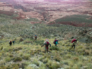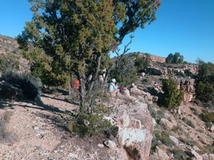 Click on photos to see larger image. Today's route stats: Distance: 2.0 miles Elevation Gain: 1700 feet Elevation Loss: 0 feetNobody was looking forward to climbing the 1700-foot steep and loose slope to the rim. The day started out cold and everyone started out hiking with jackets. We made good time, reaching the rim in about 2 hours. After a short break we hiked through the Pinyon-Juniper to our cars, which took about 40 minutes. This area (Kanab Creek Wilderness) does not appear to get many visitors. We didn't see a single soul during our entire hike, although we did see some old footprints. |