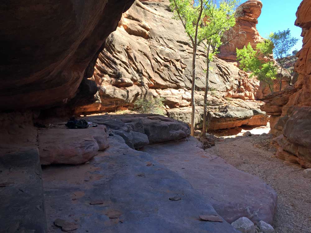 The spring comprises an old concrete trough. A pipe dug into the side of the canyon brings water to the trough. I didn't need water, so I didn't get any. A little ways below the spring I ran into 3 people hiking out to their car at the trailhead. Although the map shows a trail all the way down to near Lower Jumpup Spring, an actual trail ends at Upper Jumpup Spring. The route follows the streambed all the way, which was very easy and no obstacles were encountered. After 4.1 miles I arrived at the Ranger trail which crosses the canyon. I continued down the canyon for a quarter mile or so, past a small grove of cottonwoods. I reached the "jump" at around 2:30 PM. Bert said he would be camping either below the "jump", or, if everyone still had enough energy, would camp above the jump. The jump is a pouroff about 20 feet high, with no possibility of a bypass. But hikers have constructed a makeshift ladder from driftwood and rope. The ladder is only about 10 feet high -- the rest of the way is an easy climb, but with some significant exposure. I might have continued down past the ladder if I had been feeling more energetic. I didn't want to descend the ladder while tired. So I found a nice camp on a ledge a few hundred yards above the ladder. I left a small cache, for use on my return, consisting of one breakfast, lunch, and dinner. Update: The ladder was removed in 2020. As of May 2021, it has been replaced by a handline rope with loops.