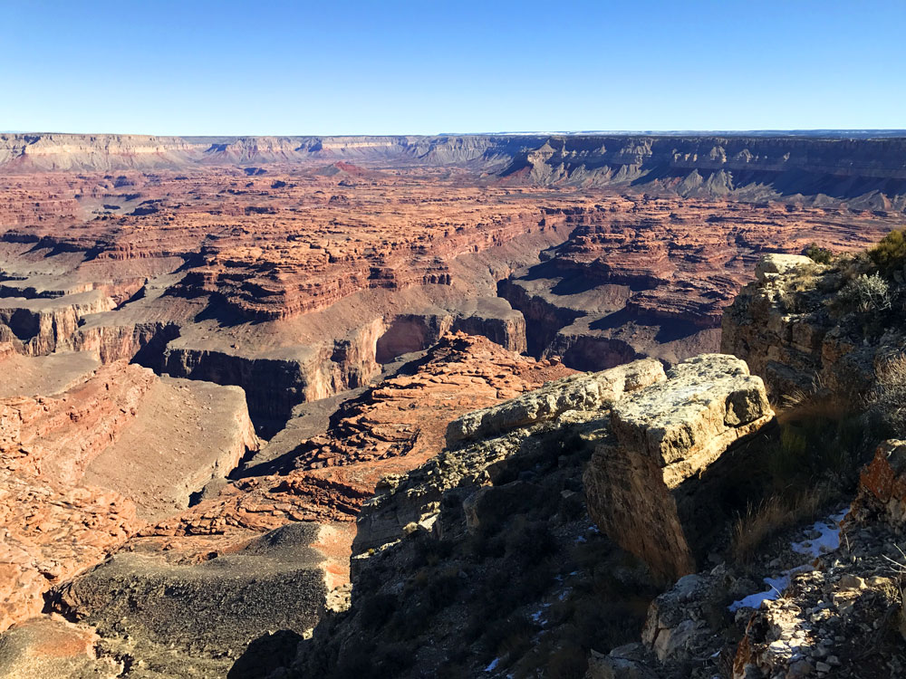 Click on photos to see larger image. I left Kanab around 7:30 AM. It is about 15 miles to the start of the Toroweap dirt road. Because there is a lot of mining and grazing in the area, the road is graded and generally in great shape. It was very cold -- 17 degrees at 8:00 AM on the Toroweap road. After something like 40 miles, I turned off onto another, much less traveled road. Unfortunately, this was the wrong road and I had to backtrack a bit. After a few more wrong turns, and several stops to consult maps and GPS, I got on the last 10 miles or so of road heading to Kanab Point. A high-clearance vehicle is highly recommended for this section, but 4-wheel-drive is unnecessary unless it has recently rained. I eventually reached Kanab Point around 10:00 AM. Kanab Point is on the rim directly above the confluence of Kanab Creek and the Colorado River. After last-minute futzing with my gear, I used binoculars to look for potholes on the Esplanade below Kanab Point. The sun was not in the best location to see reflections on the water, but I did see a number of potholes that I thought probably contained water. But because of this uncertainty, I decided to carry a bit more water than I normally would, just in case I failed to find water and would have to hike back out the next day. |