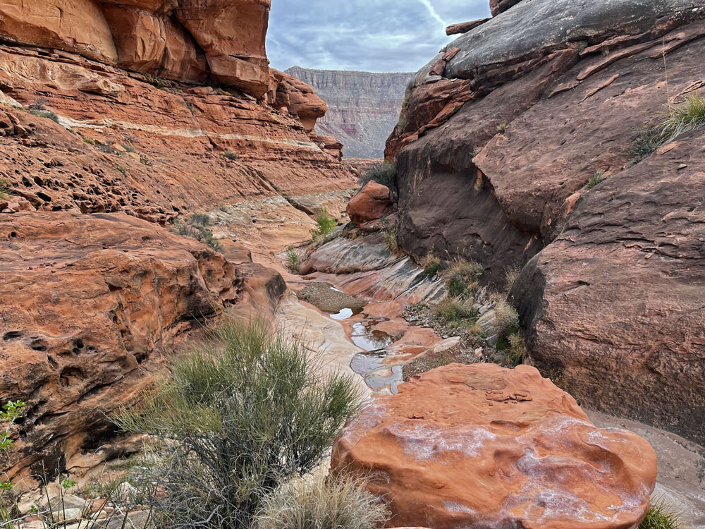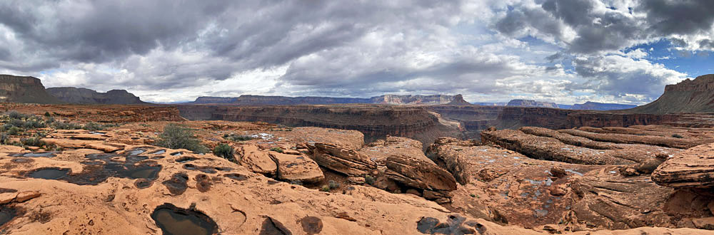 The original plan for this hike was to try (again) to hike the Esplanade from 150-Mile Canyon to Tuckup Canyon. My back kept me from getting any serious exercise before this hike, so when our start date started to loom large, it was obvious (at least to me) that this hike would never happen as planned. I had already received a permit, so Ben Mahlab and I decided to begin the hike as planned (in case I was somehow able to hike the entire route). I brought my motorcycle (Honda CRL250) to do the shuttle. I drove to Page from Taos on March 24 and picked Ben up at the airport that afternoon. We then headed for a motel for the night. The next day we drove to 150-mile trail head where I dropped off Ben and our packs. I then drove to Schmutz (Tuckup) trailhead, dropped off my car, and drove my motorcycle back to 150-mile trailhead. It is a rough 22 mile shuttle, and I flipped my motorcycle a couple of times along the way (no damage to me or the motorcycle). We camped at the trailhead that night. The next morning we headed down the "trail," which is mostly gone, but there are some cairns and some vestigial trail remains. But mostly it is a scramble thru a ravine in the Coconino until you reach the canyon bottom and Buckhorn Spring. By the time I got to the spring, it was clear I would not be able to complete the original itinerary. Ben was OK with just exploring the Esplanade as far as I wanted to go, and maybe do some day hikes. Buckhorn Spring, although small, has had good water every time I've been there, and this time was no exception. After the spring, there is no more trail going down 150-Mile Canyon, but it is a straightforward walk down the drainage. The first half mile or so is choked with boulders, but it soon clears and the hiking becomes easy on the slickrock of the canyon bottom. We passed Little Joe Spring, which had pools of good water. And a few hundred yards later we turned up into the canyon containing Hotel Spring. We spent our first night there. The next few days we headed up onto the Esplanade to some large potholes we had heard about. We camped there for two nights and did some day hiking out to the end of the point above Upset Rapids. Then back the same way. We spent our last night at Buckhorn Spring, wanting to wait for the morning to start fresh for the 1200-foot climb to the rim. Once we got to the rim, I rode my motorcycle back to the Tuckup (Schmutz) trailhead, where I dropped of the motorcycle and drove back to Ben in my 4Runner. We spent the night there before retrieving my motorcycle the next day. The photos below are roughly in the order they were taken. Click on photos to see larger image. |
