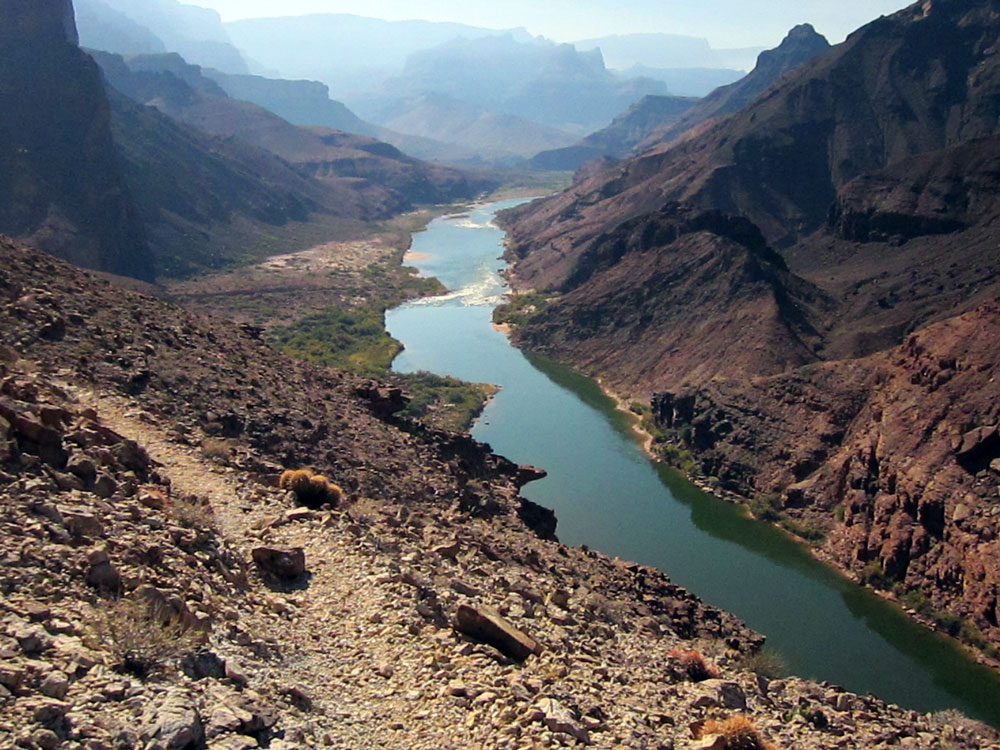 I love the section of the Beamer Trail between the LCR and Palisades. For the most part the trail stays a couple of hundred feet above the river, providing spectacular views and easy hiking. At some point along the trail, the old Hopi route drops through the Tapeats to the Colorado River. The Hopis used ropes to get down and back up. The "salt mines" are merely seeps in the Tapeats cliff where salt is deposited in small stalactites. |