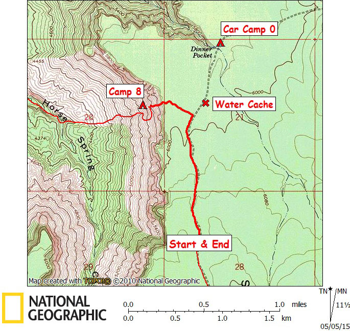 In spite of the marginal camping conditions last night, I managed to get some sleep. I ate some granola-type bars for breakfast and was ready to go by 7:00 AM. I lugged my pack up to the base of the cliff, then dropped it to scout a way up. Ben had climbed down a little ways and he told me to look for a ramp. I found one, but it looked pretty exposed. I decided to climb next to the ramp, where it was a little less exposed. It was definitely Class 4 climbing, where it was necessary to use hands not just for balance, but to actually pull myself up. The rock was rotten, and there were yucca and agave everywhere. Again I felt like I was at my limit, partly because I was still weak from yesterday's climb. I forced myself to climb up, even though it seemed pretty dangerous to me. Once above the upper cliff band, the route was less steep, but still loose and difficult. Eventually I could see Ben near the rim. He would have liked to come down to help me, but he had strained a muscle yesterday that was a bit debilitating and painful. I eventually topped out, after about 90 minutes. Ben had camped close to the rim, in the Piņon-Juniper forest. After Ben finished packing up a few last-minute items, we headed east to find the road. We came to the road in about a quarter mile. We knew our water cache was nearby, but we weren't sure which direction to go once we got to the road. Ben still had some juice left in his charger, so we charged my iPhone just enough so we could use the GPS. It turned out that we were only a hundred yards from our water. After filling up with water, we dropped our packs and started down the road to our car. We were not sure how far away it was, but it turned out to be only about 3/4 miles away. Once at the car, we changed into less dirty and smelly clothes, and began the long drive back to St. George. Ben had a late flight to catch in Las Vegas, so we knew we still had plenty of time. I think it was around 4:00 PM when I dropped him off at the Shuttle Office in St. George. I headed to Page, AZ, where I checked into a motel for the night.
