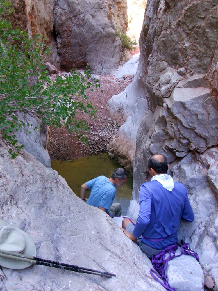 hidden in a cleft in the Redwall and is not obvious. But it was full of water, although not the cleanest. We each collected a liter or two before continuing on to Indian Hollow. After 15 or 20 minutes into Indian Hollow, we came to Steck's Obstacle Pool. It was dry, but was still an obstacle. Some of us climbed up and around the pool via a narrow ledge. The ledge was so narrow in one place that nobody wanted to do it carrying their pack. However there is a convenient place to lower packs just before the narrow section. In approximately 30 minutes past the Obstacle Pool, we came to Ojojojo Canyon (Steck's name) where we collected a little more water. And in another 20 minutes we came to Steck's "Over Your Head" pool, a very large pothole in the middle of the stream bed.