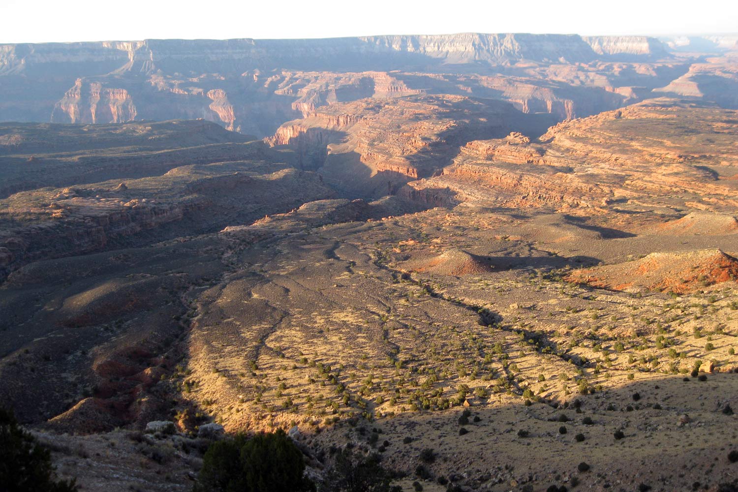 October 11, 2009. We got up early, as usual for this group, and were soon on the Bill Hall Trail, peering over the edge into the vast slickrock expanse of the Esplanade. This photo shows the Sinyella Fault running diagonally, starting at the upper right corner of the picture. We will head down this fault, which is where Cranberry Canyon is located. Deer Creek intercepts this fault from the upper left of the photo. Our route takes us to the right of the small, reddish mound near the center of the photo.