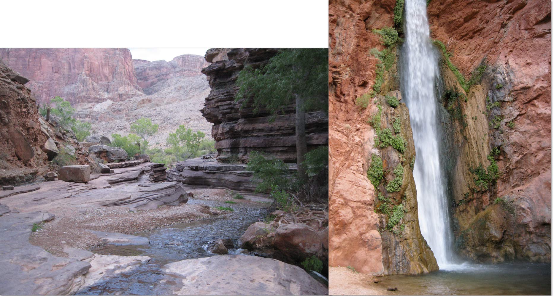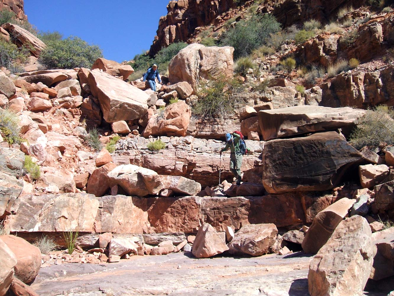 Our goal for today was a beach a little was before Kanab Creek. We first walked down to the "patio", then through the narrows and down to the falls (see photos). We would follow the river bank towards Kanab Creek, which was about 8 miles away. It is somewhat arduous because of all the talus blocks, tammies, and catclaw