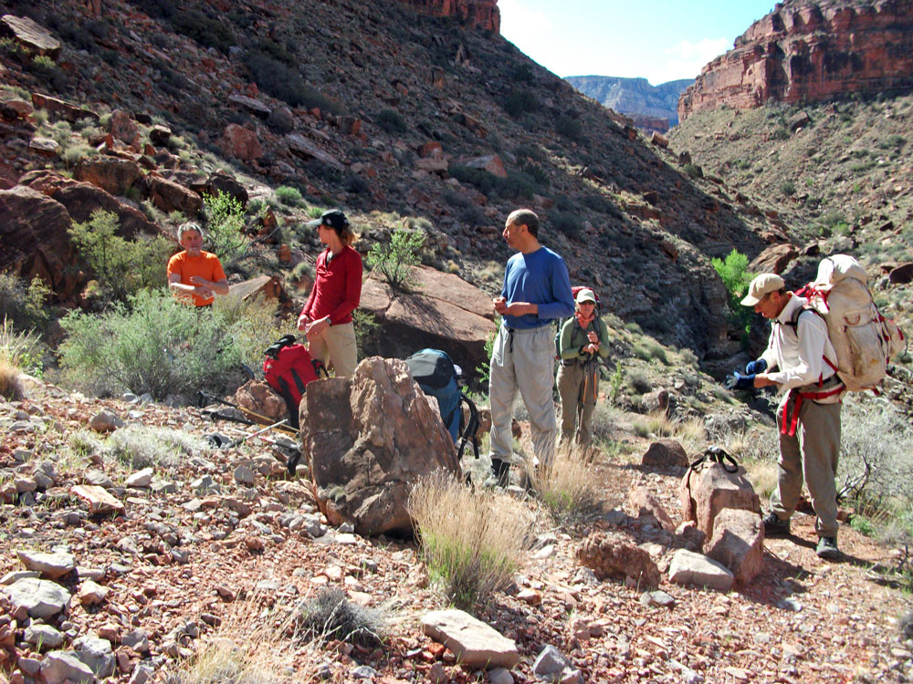 Around half way along the Redwall from Kwagunt to Flipoff, I spotted a large rock near where we were taking a break. I walked over to it and found a nice little petroglyph. The native Americans were everywhere. Eventually we passed the mouth of Jumpup Canyon below us and turned northward above Kanab Creek. As we continued hiking, the canyon bottom slowly rose to meet us. We were able to look down to the campsite where we left Susan and see that she was no longer there. About half a mile farther we were able to find an easy slope down to the canyon bottom. We found Susan's cairn and note at the mouth of Flipoff, saying she was going to be camping at the Cottonwood grove. About 45 minutes later we found her. We decided to camp right where she was (we had already covered 11 miles today). Susan's knee was still in bad shape, but maybe a little better. |
